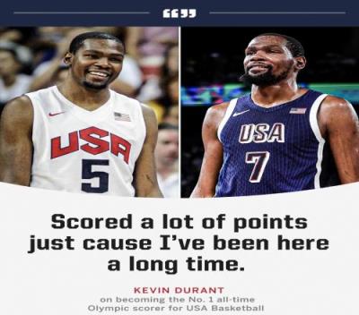 此役,美国男篮前锋杜兰特拿到11分,个人在奥运会累计得分达到494分,成为美国篮球奥运得分王。