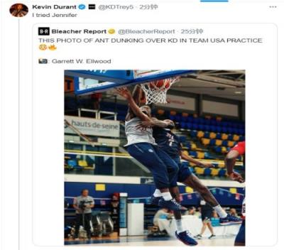 体育资讯07月26日报道宣称 《露天看台》晒出了一张美国男篮训练时爱德华兹隔扣杜兰特的照片,杜兰特本人转发回复道:“我尽力了Jennifer。”