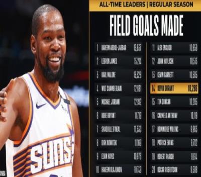 杜兰特的生涯命中数来到10286,超越蒂姆-邓肯,上升至NBA历史第14位。