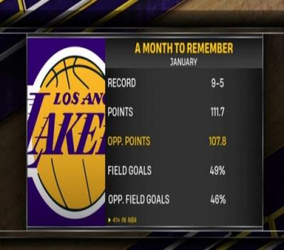 赛前转播方分享了一组数据:湖人在一月份战绩为9胜5负,场均得到111.7分,失分107.8分(联盟第四少),投篮命中率49%,对手投篮命中率46%。