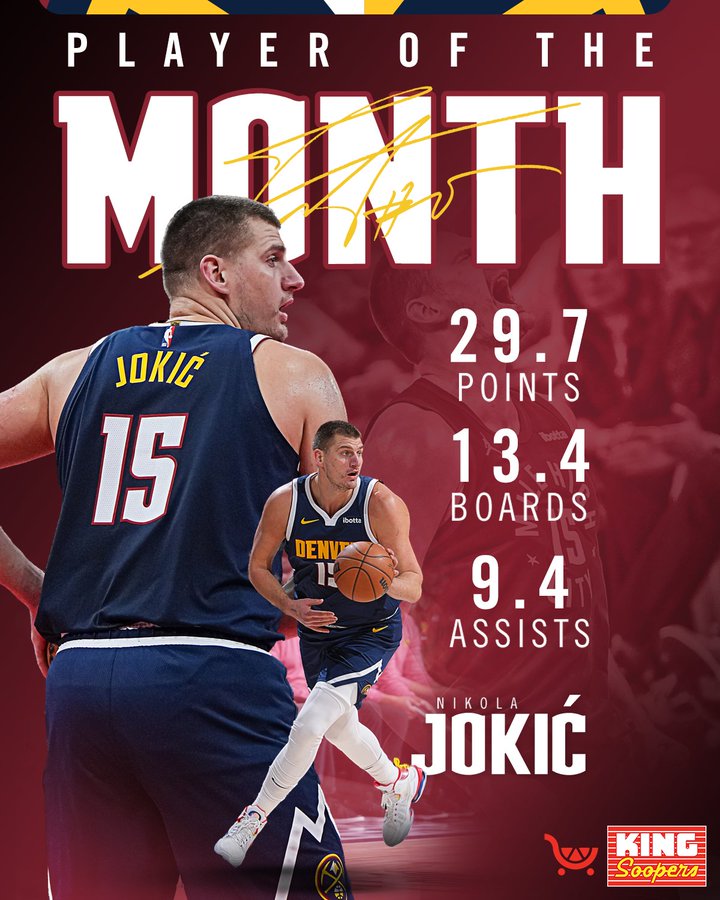 据掘金官方推特消息,尼古拉-约基奇在11月的表现令人瞩目,场均能够砍下29.7分13.4篮板9.4助攻的数据,成绩十分出色。