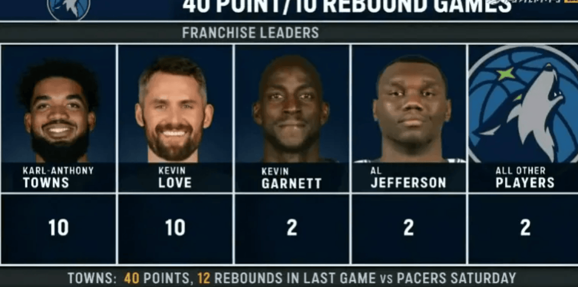 唐斯与乐福并列森林狼队史40+10场次纪录