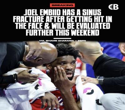 此前76人宣布,球队中锋恩比德遭遇鼻窦骨折,将在本周末进行进一步的伤情评估。