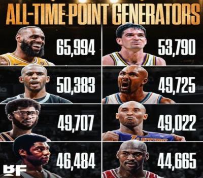 体育资讯12月3日报道宣称 今天,美媒Basketball Forever晒出了在NBA历史上,球员个人生涯得分及助攻所创造的得分总数榜,具体如下: