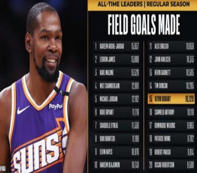 杜兰特运动战进球数超越甜瓜上升至NBA历史第15位&将追邓肯