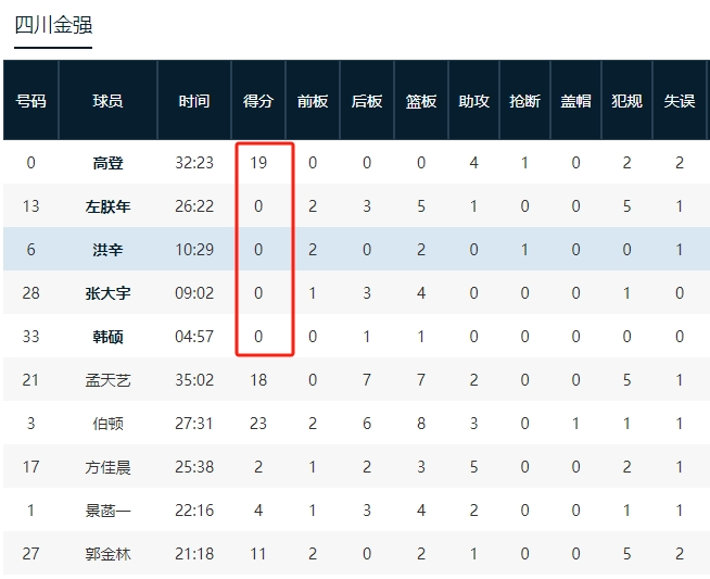 四川五名首发中,除了高登之外,其他四人得分全部挂零。 本场比赛,四川派出了韩硕、张大宇、左朕年、洪辛和高登作为首发阵容。最终的比赛数据显示,韩硕只有1个篮板,张大宇因受伤离场得分为空手,左朕年重新登场但依然没有得分,洪辛也只有2个篮板。只有高登独自拿下19分,并贡献了4次助攻。