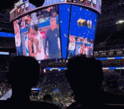 赛后,勇士球员李凯尔和前队友小贾伦-杰克逊在场地中央寒暄拥抱,大屏幕也记录了这一温馨时刻。
