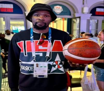 赛后,杜兰特得到了本场比赛的比赛用球,上面签满了名字。