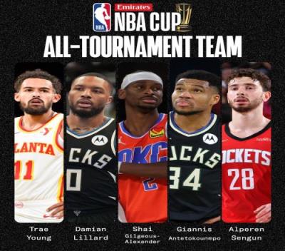 体育资讯12月20日报道宣称 NBA官方公布了本届NBA杯的最佳阵容:字母哥、亚历山大、利拉德、申京和特雷-杨。
