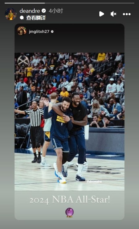 丹佛掘金队的老将小乔丹,在今天通过Instagram展现了对队友贾马尔·穆雷的巨大信心。他上传了一张与穆雷的合照,并自信地预测:“2024年全明星。”