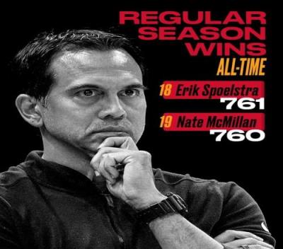 赛后,热火官方晒出海报,祝贺主帅斯波的执教胜场数来到761场,超越麦克-米兰独享历史第18位。