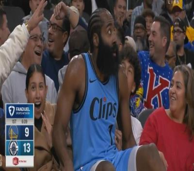 哈登大帽之后落入观众席身边两个女球迷喜上眉梢