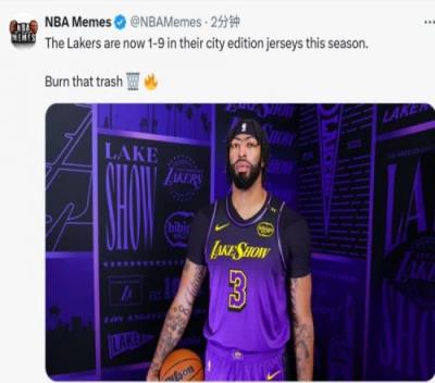 赛后美媒NBA Memes发推写道:“本赛季湖人穿着城市版球衣作战时,战绩为1胜9负。烧掉这垃圾球衣吧。 ”