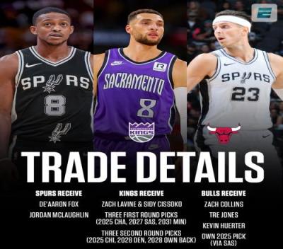 公牛得到:扎克-科林斯、特雷-琼斯、许尔特、从马刺回收自己25年首轮签。