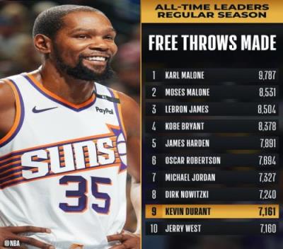 在本场比赛中,杜兰特的生涯罚球命中数超越杰里-韦斯特,上升至NBA历史第九位。