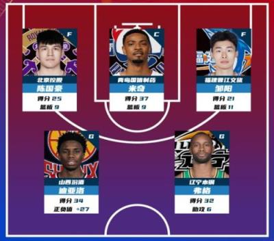 2024-2025赛季CBA联赛常规赛第31轮结束较量,来自北京控股篮球俱乐部的、青岛国信海天篮球俱乐部的米奇、福建浔兴SBS男篮的邹阳、山西汾酒职业篮球俱乐部的迪亚洛和辽宁沈阳三生飞豹篮球俱乐部的凯尔-弗格入选CBA联赛常规赛第31轮最佳阵容!