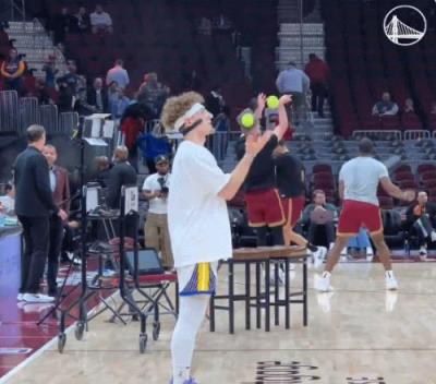 找找手感波杰姆斯基赛前热身抛接3个网球全程不落地