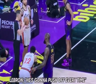 詹姆斯防守CC破坏球权出界,随后朝裁判抱怨:他每回合都大肘子开路推人!