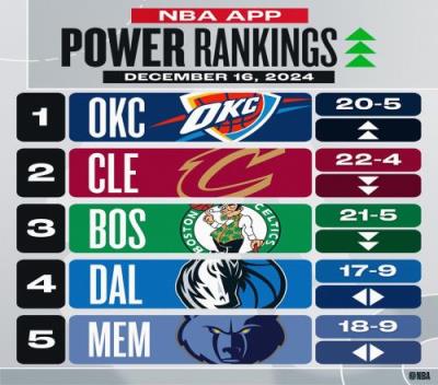 1.雷霆(上周排名第3),2.骑士(上周排名第1),3.绿军(上周排名第2),4.独行侠(上周排名第4),5.灰熊(上周排名第5);