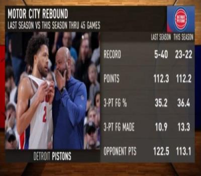 本赛季至今,活塞取得23胜22负,暂列东部第六;而上赛季同期他们仅5胜40负。