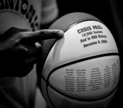 球上写有:“克里斯-保罗、12092次助攻,NBA历史第二,2024年12月8日(当地时间)。”