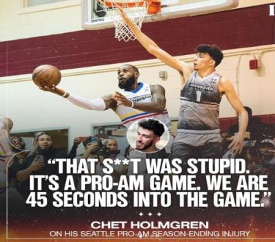 他说:“比赛里有一群全明星,所以我就是试图上场打球。说实话,我想那个夏天我确实打得太多了,我到处打球。我在洛杉矶去一个开车单程需要一个半小时远的地方,只为打一场野球。我想我就是打得太多了。但我并不觉得这次伤病是因为我打了太多比赛导致的。这次受伤非常诡异,你知道,你无法真正控制(自己不受伤)。有时你只是一步走错了,然后就伤了。”
