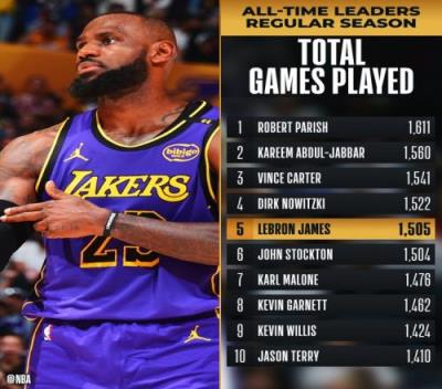 詹姆斯首发出战,生涯常规赛出场次数达到1505场,超越斯托克顿,独占NBA历史第五位,详情如下: