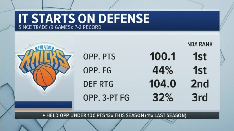 自完成交易以来,尼克斯队出色的防守表现让球迷们欣喜不已。他们在过去的9场比赛中取得了7胜2负的出色战绩,场均限制对手得分在100.1分以下,稳居联盟第一。更令人惊讶的是,他们限制对手的命中率为44%,同样排名联盟第一,展现出了出色的控制力。尼克斯队的防守效率也位居联盟第二,进一步证明了他们的实力。此外他们还限制对手的三分命中率为32%,在联盟中排名第三。