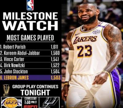詹姆斯生涯出场次数将追平斯托克顿并列NBA历史第五