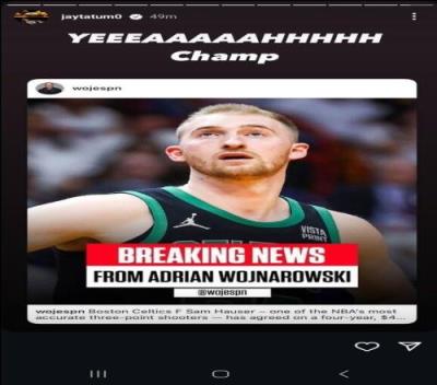 塔图姆更新社交媒体转发了豪泽续约报道并写道:“Yeeeaaaaahhhhh,冠军。”