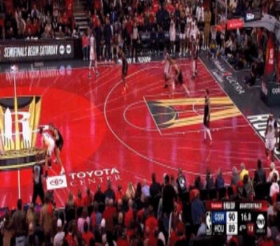 在最后时刻,库里出手三分,两队争抢篮板球,最终吹罚勇士犯规,送火箭两罚反超。