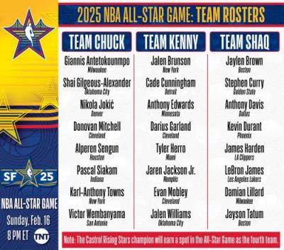 ⭐每支全明星球队将有八名球员,并以TNT NBA分析师的名字命名,24名NBA全明星球员将被平均分成三支球队,名单由TNT解说员和球队荣誉经理查尔斯-巴克利、沙奎尔-奥尼尔和肯尼-史密斯选出。