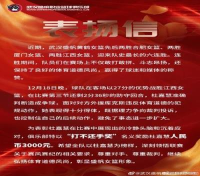 据武汉女篮官方的描述,在昨晚武汉盛帆黄鹤与赣州赣星的比赛中,杜嘉慧造成争球,面对江西队外援库克斯违反体育道德的犯规动作,她既据理力争向裁判投诉,也控制住自己的后续动作,避免了事态进一步扩大。该俱乐部称:“颁发此奖项也是为了鼓励杜嘉慧尊重对手、尊重裁判的行为。”