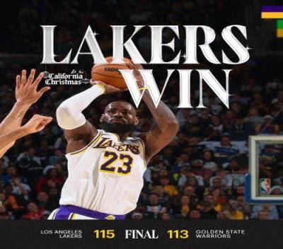 体育资讯12月26日报道宣称 NBA圣诞大战,湖人115-113险胜勇士。