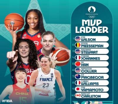 体育资讯07月27日报道宣称 国际篮联(FIBA)官方公布了巴黎奥运会女篮首期MVP榜单,阿贾-威尔逊居首,梅斯曼力压布里安娜-斯图尔位列次席,韩旭排名第五,美国3人入选。