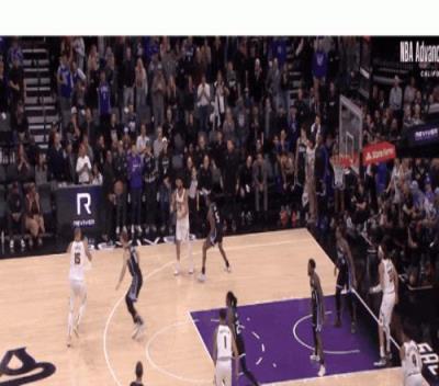 这个蹲膝假动作,后面还有应用:最后时刻,约基奇被夹击,威少右翼接球,一个蹲膝假动作,国王立刻扩防:补威少,补穆雷,威少轻松回传给约基奇,抛射。