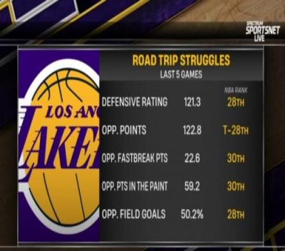 防不住!湖人五连客期间五项与防守有关数据非常差