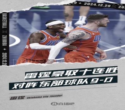 雷霆成为了继骑士之后,本赛季第二支取得10连胜的球队。同时,雷霆对阵东部球队的战绩来到了9胜0负。