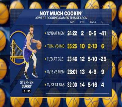 转播方赛后晒出本赛季库里得分最低的5场比赛数据,除了今天外的比赛如下: