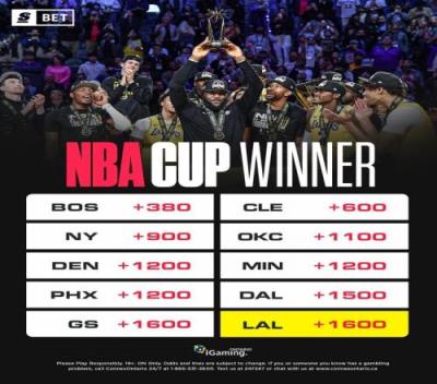 体育资讯11月12日报道宣称 NBA杯明日开打,博彩公司公布了本届NBA杯赛夺冠赔率,具体如下: