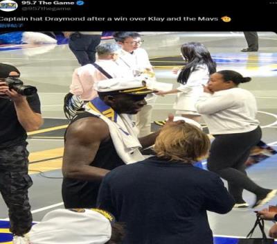 赛后,追梦在场边戴上了克莱常戴的船长帽,同时看到他竖起大拇指。