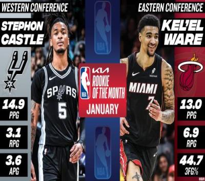 1月最佳新秀:卡斯尔场均14.9+3.1+3.6韦尔场均13+6.9&三分44.7%