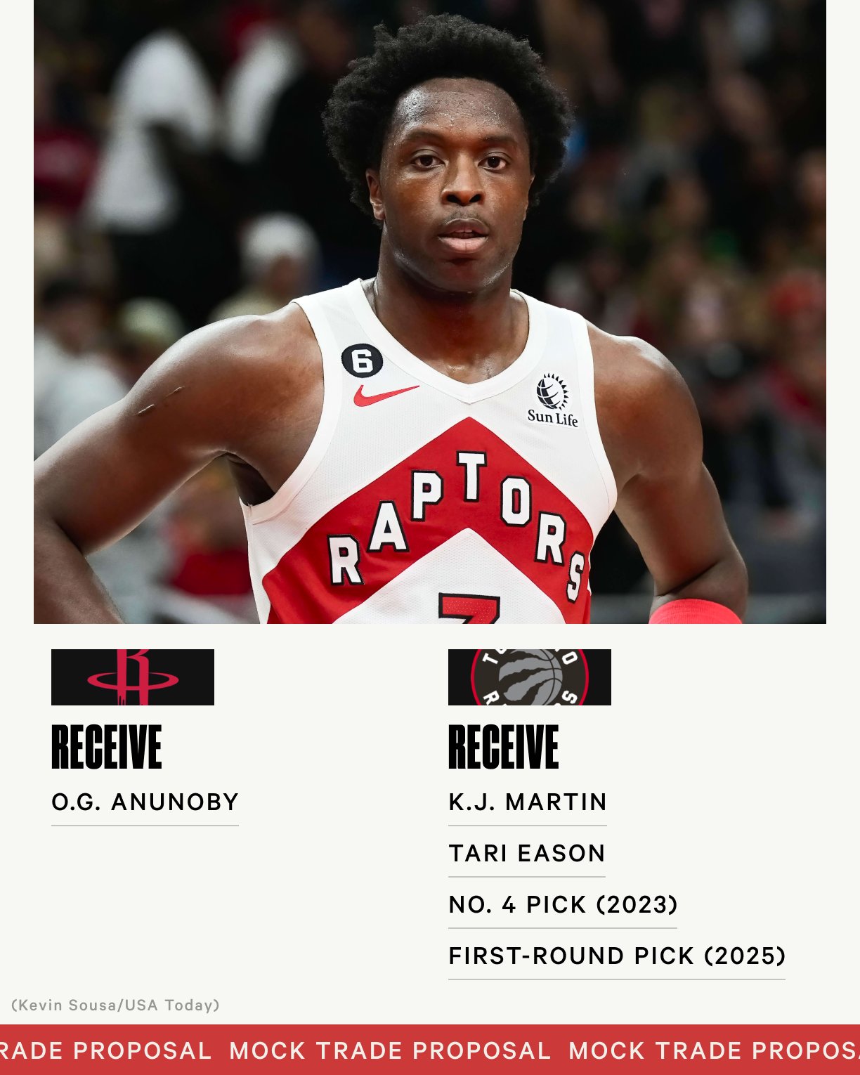 其中,一种和猛龙的交易方案是:火箭送出KJ-马丁,塔里-伊森,2023年4号签以及2025(前6保护)首轮签,从猛龙得到阿努诺比!