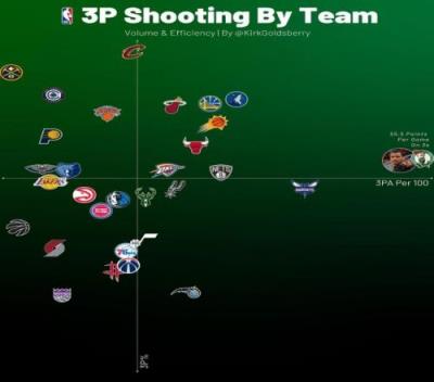 体育资讯11月15日报道宣称 今天,数据专家Kirk Goldsberry在INS上晒出了本赛季各队百回合三分出手数和三分命中率的象限图。