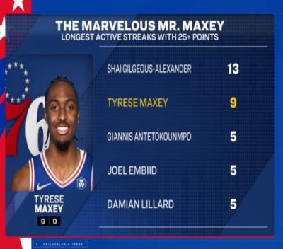这是马克西连续第9场比赛得到25+,联盟现存第二长,仅次于亚历山大的13场。