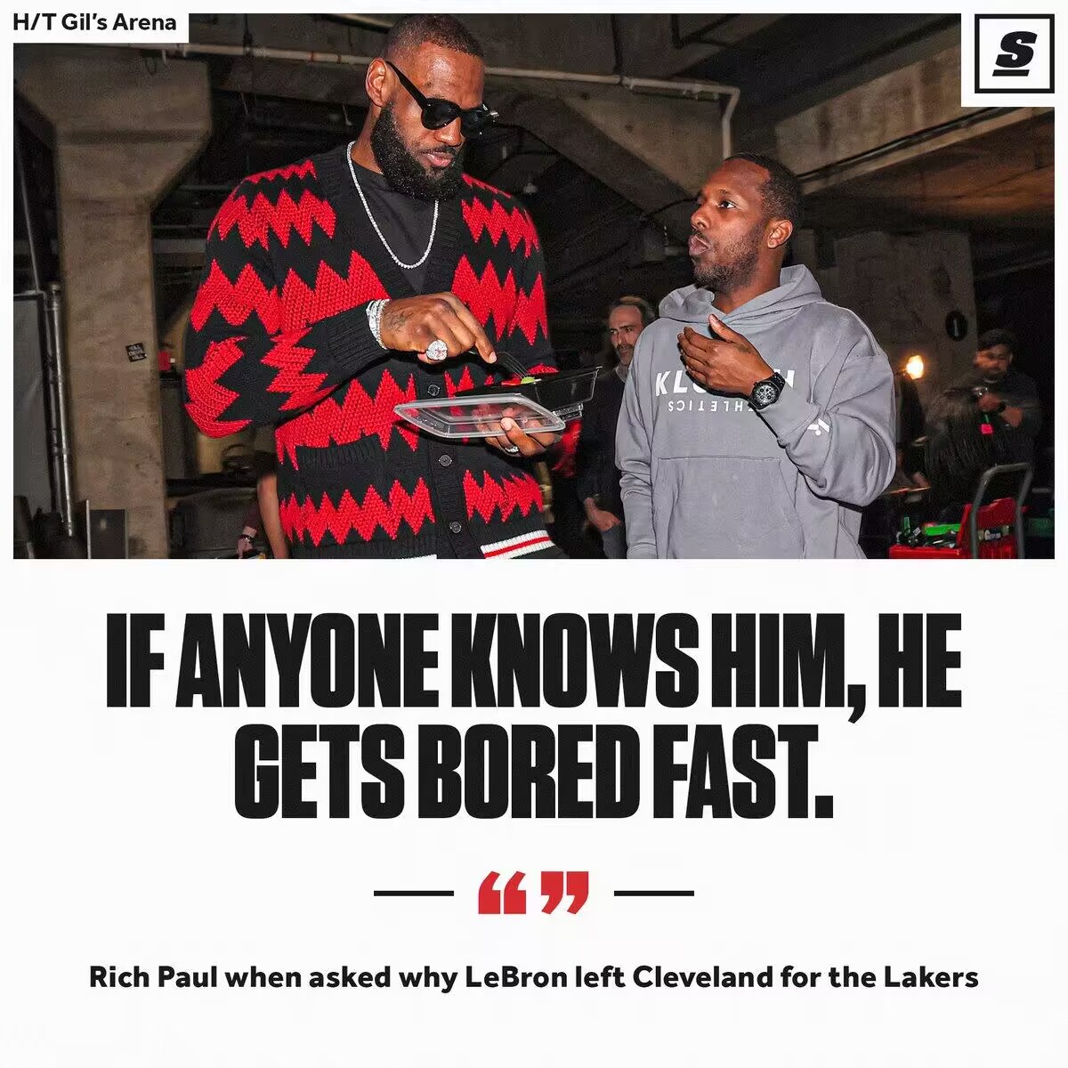 “对于詹姆斯来说,他在骑士已经取得了巅峰成就,带领球队获得了历史性的NBA总冠军。但真正了解他的人会明白,詹姆斯是一个对挑战永远充满渴望的人。他很快就会觉得无聊,因为对于他这样的顶级球员,长时间的统治确实让他感到寂寞。”里奇-保罗表示。