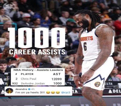 保罗的前队友小乔丹也达成了自己的一项小小里程碑,生涯助攻数来到1000个,可以排在NBA历史第932位。