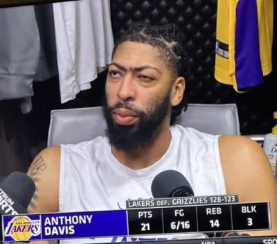 浓眉全场出战32分钟,16投6中(三分3中2)、罚球8中7,得到21分14篮板3助攻3盖帽,出现5次犯规,正负值-6。末节浓眉连续远投提供输出,最后时刻稳稳将球罚进、随后收下篮板锁定胜局。