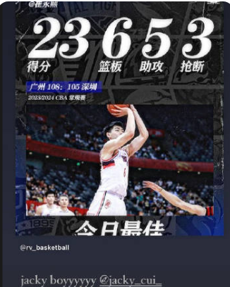 据媒体人士“后厂村体工队”的消息,李凯尔转发了崔永熙赛后的数据图,显示他在昨晚的比赛中的出色表现,这表明李凯尔对他的关注和支持。