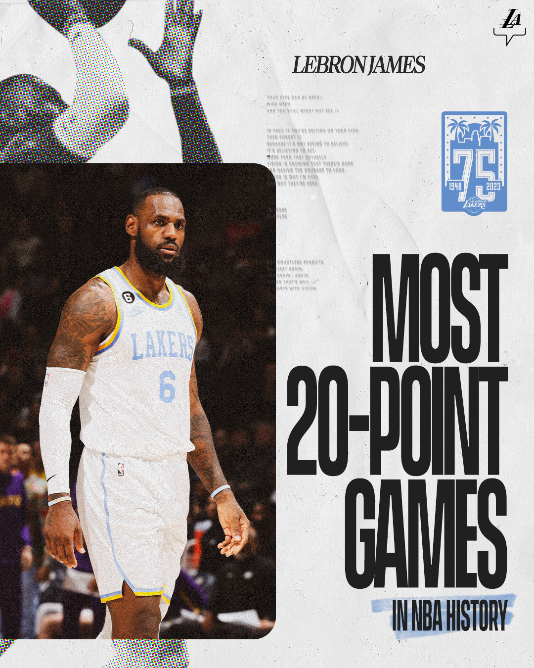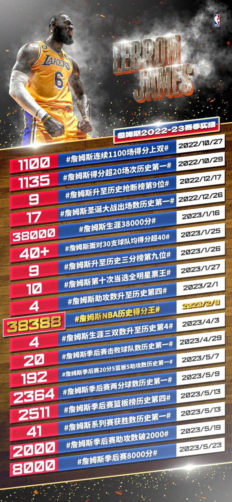 此前结束的NBA季后赛西决中,湖人大比分0-4惨遭横扫,詹姆斯和球队本赛季的征程就此止步。在自己的第20个赛季里,已经38岁的詹姆斯仍然在刷新着纪录,本赛季的老詹有哪些值得铭记的里程碑?今天老震来带大家盘点下(按时间由近及远排序)。